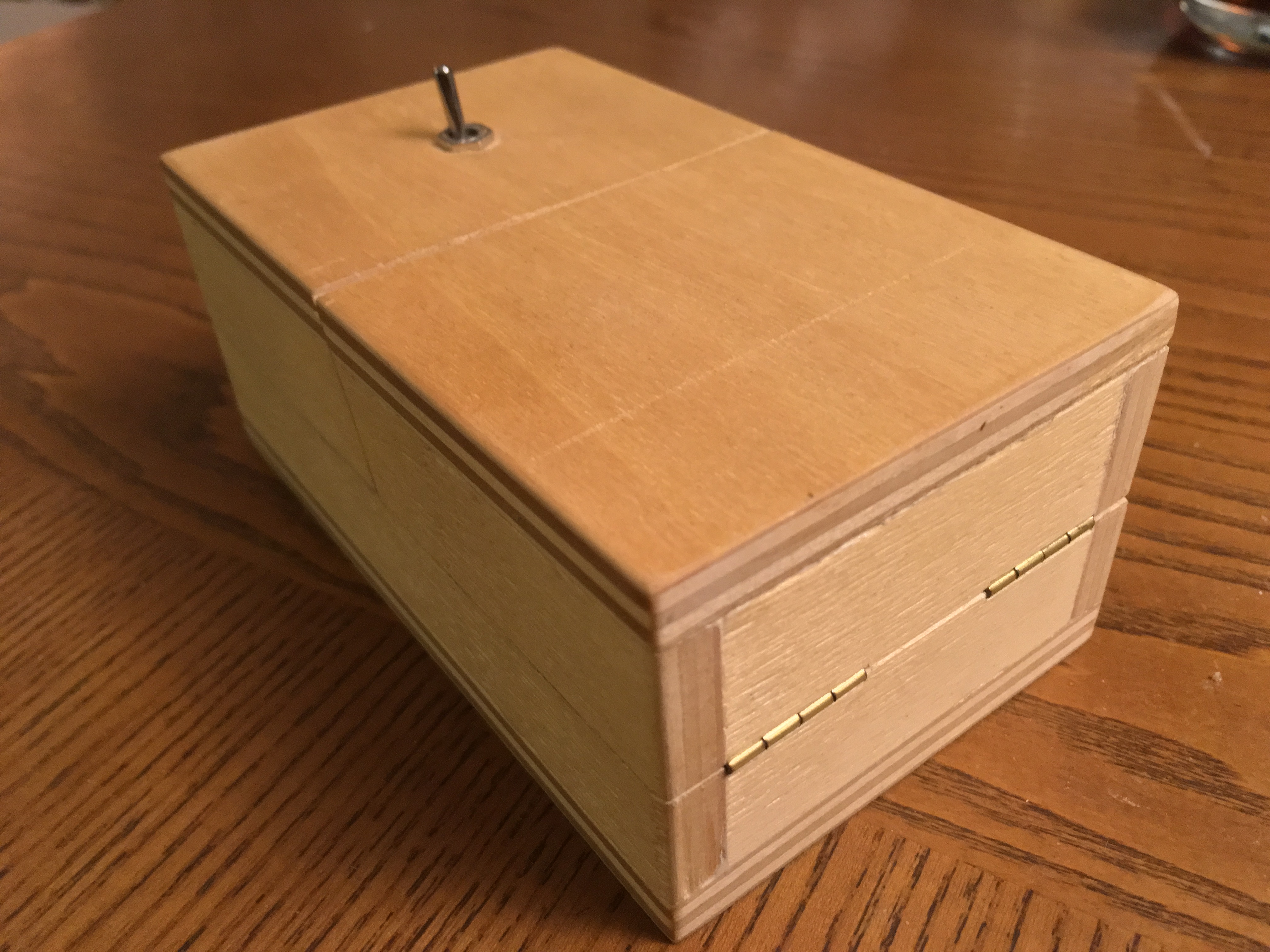 The box also includes two blocks of cast lead in order to increase the overall weight of the box to give it a rather more appealing feeling when handled. One of these blocks also help the main lid close down stronger making a snapping sound once the two faces of plywood hit together. I believe such effect contributes a lot to the user’s general feeling about the machine, making the device even ‘crankier.’